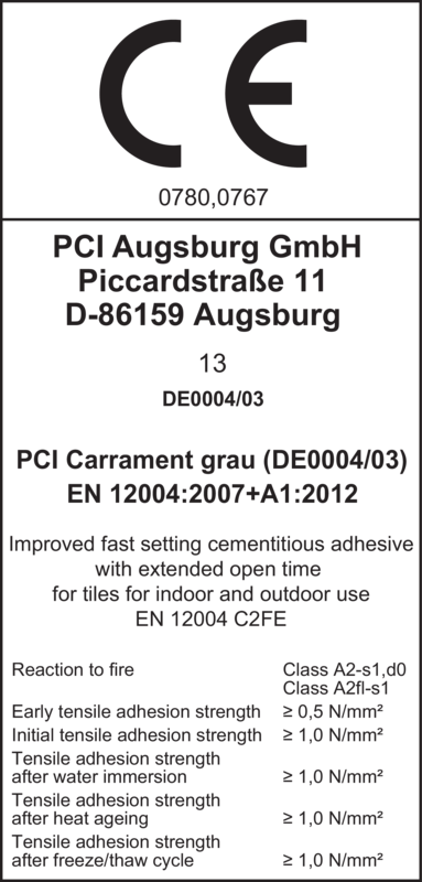 - Med tilsætning af PCI Lastoflex, opfyldes C2FE S2 klassificeringen i henhold til DIN 12004 og 12002.